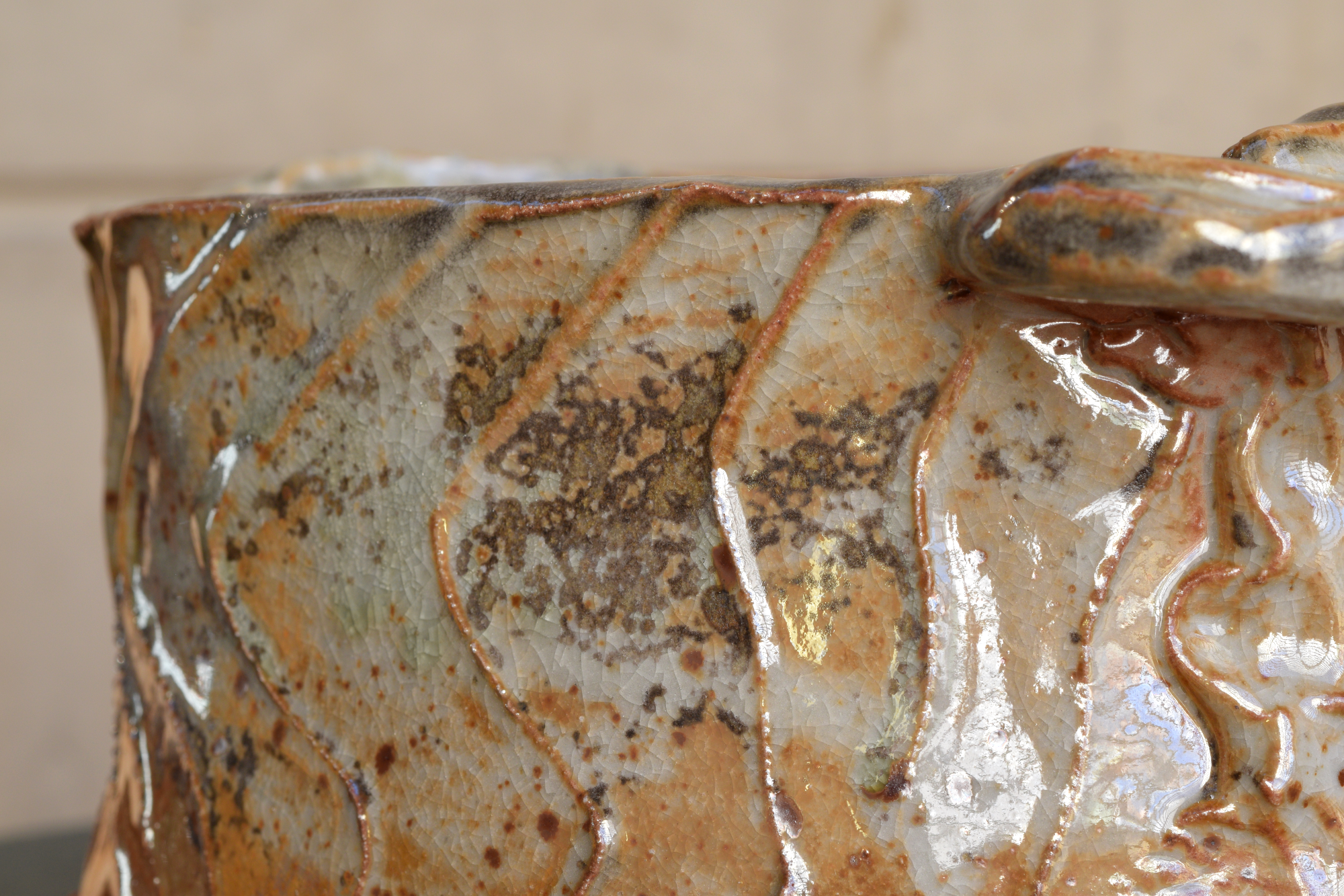 I fire in reduction in a gas kiln, and occasionally wood-fire in a kiln in the Peak District. I use a limited pallet of glazes, but mostly explore Shino glazes, adding wild clay and spraying with wood ash. I enjoy the lively surfaces and intense iron speckles that occur, in an often unpredictable fashion, when firing with a flame.